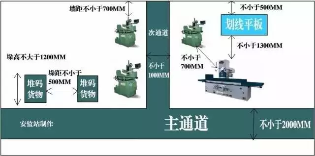 機(jī)床與劃線或檢驗(yàn)平板之間的最小距離應(yīng)不小于 1300 mm 平板與墻壁間的距離應(yīng)不小于500 mm。《金屬切削加工安全要求》(JB 7741 1995)4.5.3