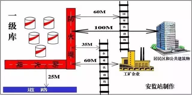 甲B、乙類液體:地上罐組;甲B、乙類覆土立式油罐;無(wú)油氣回收設(shè)施的甲B、乙A類液體裝卸碼頭(一級(jí)庫(kù)):距離居民區(qū)和公共建筑物100米,距離工礦企業(yè)60米,距離國(guó)家鐵路線60米,距離工業(yè)企業(yè)鐵路線35米,距離道路25米。