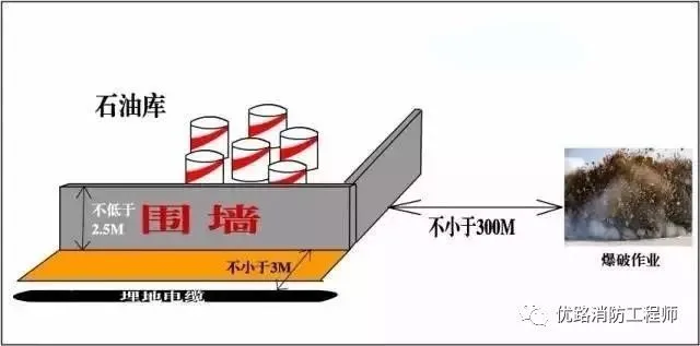 油庫(kù)的圍墻與爆破作業(yè)場(chǎng)地(如采石場(chǎng))的安全距離,不應(yīng)小于300m!妒蛶(kù)設(shè)計(jì)規(guī)范》(GB50074-2014)4.0.12
