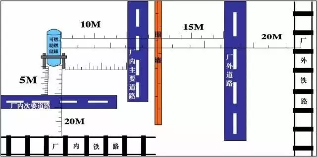 可燃、助燃?xì)怏w儲(chǔ)罐與廠外鐵路中心線、廠內(nèi)鐵路中心線、廠外道路路邊、廠內(nèi)主要道路路邊和廠內(nèi)次要道路路邊的防火間距不應(yīng)小于25、20、15、10和5米!督ㄖO(shè)計(jì)防火規(guī)范》(GB50016-2014)4.3.6