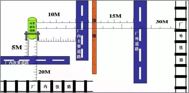 丙類液體儲(chǔ)罐與廠外鐵路中心線、廠內(nèi)鐵路中心線、廠外道路路邊、廠內(nèi)主要道路路邊和廠內(nèi)次要道路路邊的防火間距不應(yīng)小于30、20、15、10和5米!督ㄖO(shè)計(jì)防火規(guī)范》(GB50016-2014)4.2.9