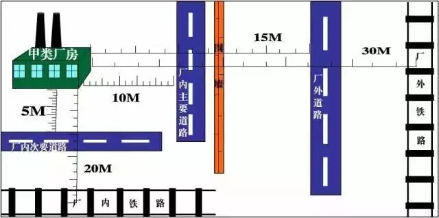散發(fā)可燃?xì)怏w、可燃蒸氣的甲類廠房與廠外鐵路中心線、廠內(nèi)鐵路中心線、廠外道路路邊、廠內(nèi)主要道路路邊和廠內(nèi)次要道路路邊的防火間距不應(yīng)小于30、20、15、10和5米!督ㄖO(shè)計(jì)防火規(guī)范》(GB50016-2014)3.4.3