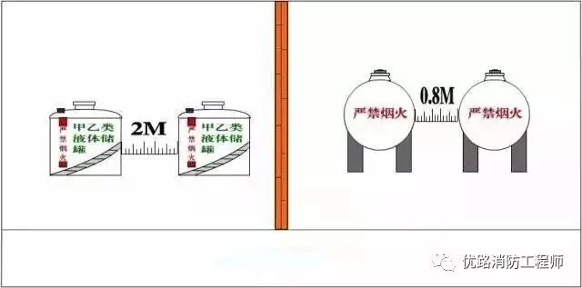 甲乙丙類液體儲(chǔ)罐成組布置時(shí),組內(nèi)儲(chǔ)罐的布置不應(yīng)超過(guò)兩排,甲乙類液體立式儲(chǔ)罐之間的防火間距不應(yīng)小于2M,臥式儲(chǔ)罐之間的防火間距不應(yīng)小于0.8M!督ㄖO(shè)計(jì)防火規(guī)范》(GB50016-2014)4.2.3