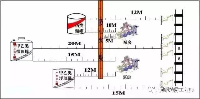 甲乙拱頂罐與其泵房、鐵路及裝卸鶴管的防火間距為15米和20米;甲乙浮頂罐與其泵房、鐵路及裝卸鶴管的防火間距為12米和15米;丙類液體儲(chǔ)罐與其泵房、鐵路及裝卸鶴管的防火間距為10米和12米。泵房和裝卸鶴管與儲(chǔ)罐防火堤外側(cè)基腳線的距離不應(yīng)小于5米!督ㄖO(shè)計(jì)防火規(guī)范》(GB50016-2014)4.2.7