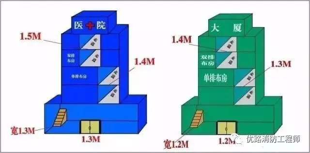 高層醫(yī)療建筑樓梯間的首層疏散門和首層疏散外門的寬度為1.3米,單排布房的走道寬1.4米,雙排布房的走道寬1.5米,疏散樓梯寬1.3米。其它高層建筑樓梯間的首層疏散門和首層疏散外門的寬度為1.2米,單排布房的走道寬1.3米,雙排布房的走道寬1.4米,疏散樓梯寬1.2米。 《建筑設(shè)計(jì)防火規(guī)范》(GB50016-2014)5.5.18