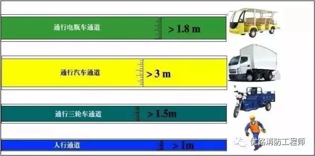 通行汽車,寬度>3 m;通行電瓶車,寬度>1.8 m;通行手推車、三輪車,寬度>1.5 m;一般人行通道,寬度>1 m。(未查到相關(guān)標(biāo)準(zhǔn),但在注安考試教材中有明確說(shuō)明)