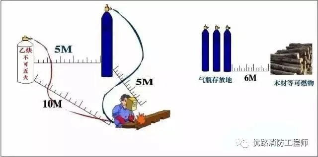 氣瓶在儲(chǔ)存時(shí)必須與可燃物、易燃液體隔離,并且遠(yuǎn)離容易引燃的材料(諸如木材、紙張、包裝材料、油脂等)至少6 m 以上。《焊接與切割安全》(GB9448-1999)10.5.3