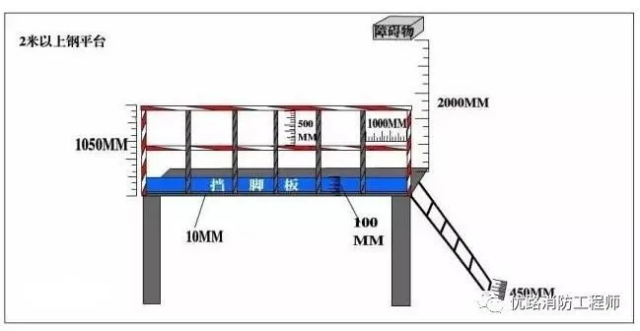 平臺(tái)地面到上方障礙物的垂直距離不應(yīng)小于2000MM!豆潭ㄊ戒撎菁捌脚_(tái)安全要求第3部分:工業(yè)防護(hù)欄桿及鋼平臺(tái)》(GB4053.3-2009)6.2.1