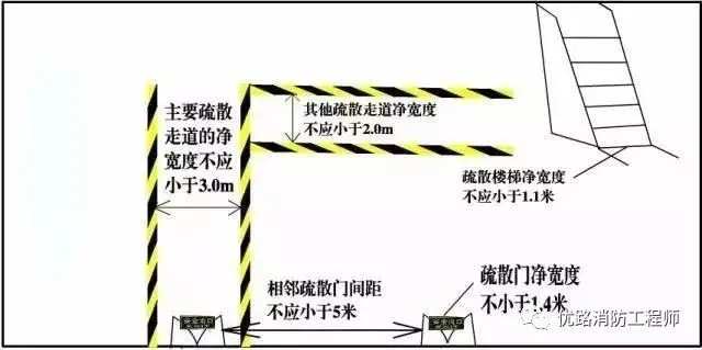 除本規(guī)范另有規(guī)定外,公共建筑內(nèi)疏散門和安全出口的凈寬度不應(yīng)小于0.9米,疏散走道和疏散樓梯的凈寬度不應(yīng)小于1.1米!督ㄖO(shè)計(jì)防火規(guī)范》(GB50016-2014)5.5.18