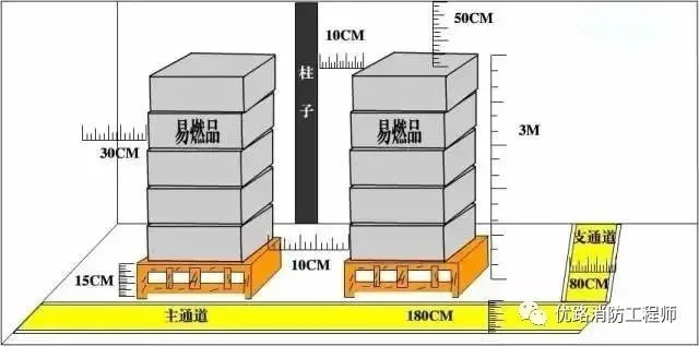 堆垛間距:主通道大于或等于180CM,支通道大于或等于80CM,墻距大于或等于30CM,柱距大于或等于10CM,垛距大于或等于10CM,頂大于或等于50CM。《易燃易爆性商品儲(chǔ)存養(yǎng)護(hù)技術(shù)條件》(GB17914-2013)6.2