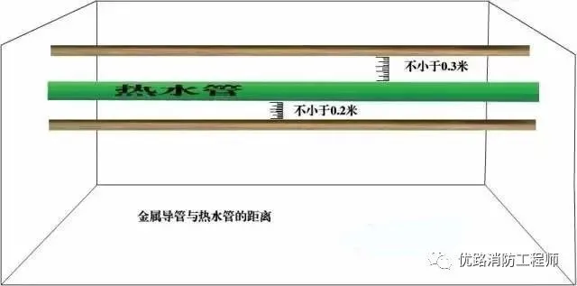 金屬導(dǎo)管和金屬槽盒敷設(shè)時(shí),敷設(shè)在熱水管下方時(shí),不宜小于 0.2m;在上方時(shí),不宜小于0.3m;《低壓配電設(shè)計(jì)規(guī)范》(GB50054-2011)7.2.11
