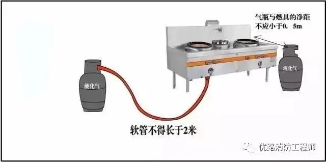 氣瓶與燃具的凈距不應(yīng)小于0.5m!冻 鎮(zhèn) 燃 氣 設(shè) 計(jì) 規(guī) 范》(GB50028-2006)8.7.2